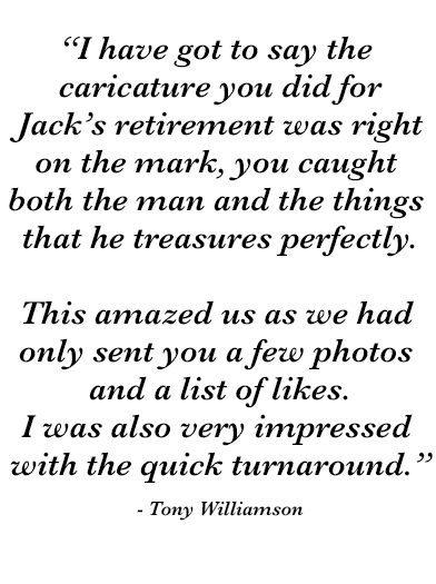 Looking for a unique, lasting gift that celebrates their life in a fun and memorable way? My personalised gift caricatures are full of details and are perfect for every occasion. From landmark Birthdays (normally so hard to buy for) to Weddings, Anniversaries, Retirements and Farewells. Really any of life’s events worth remembering. You get the original hand drawn and painted caricature, no print-outs here! Easy to order- fun to give!